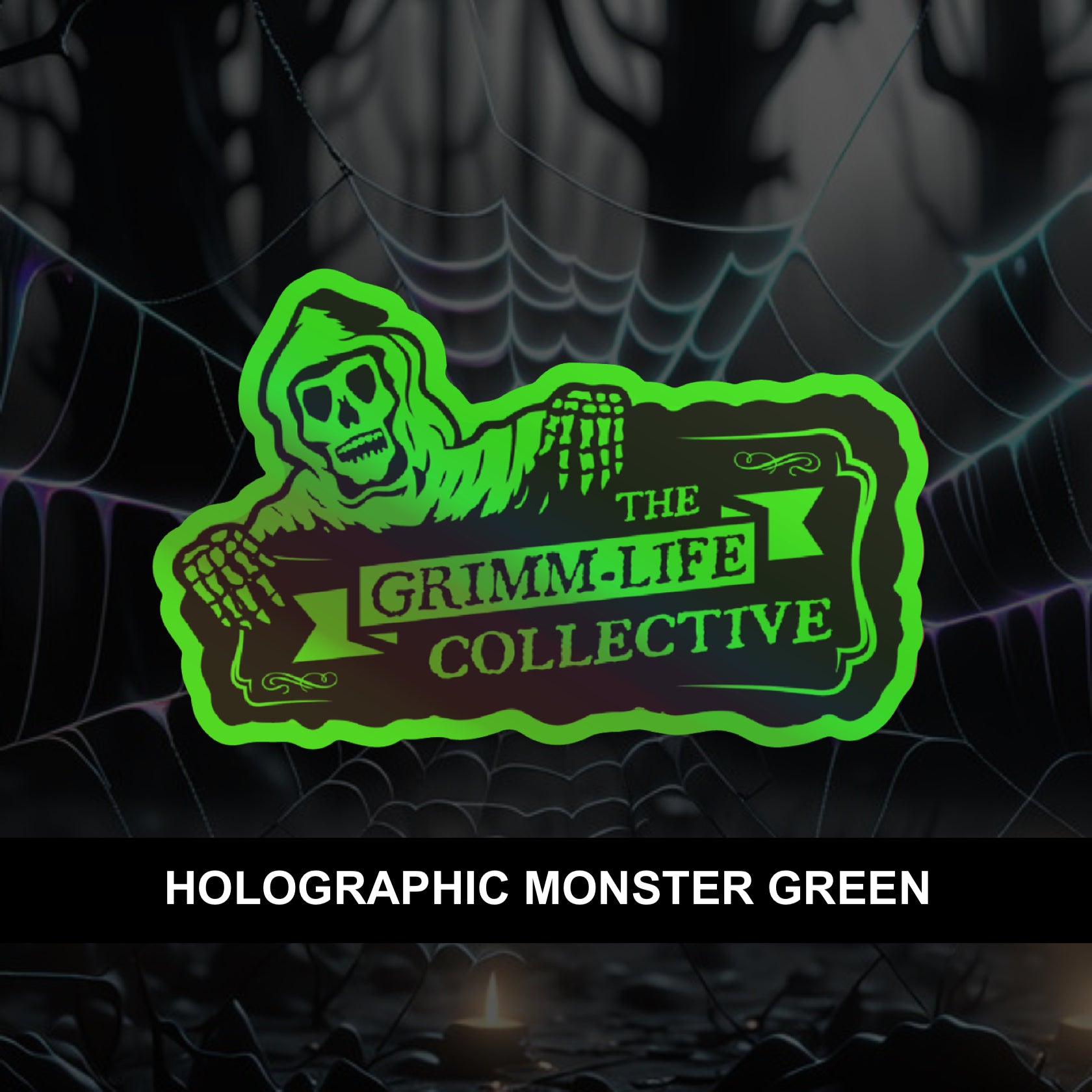 Show your support of The Grimm Life Collective with an Official Holographic Monster Green Grimm Ghoul Logo Sticker.